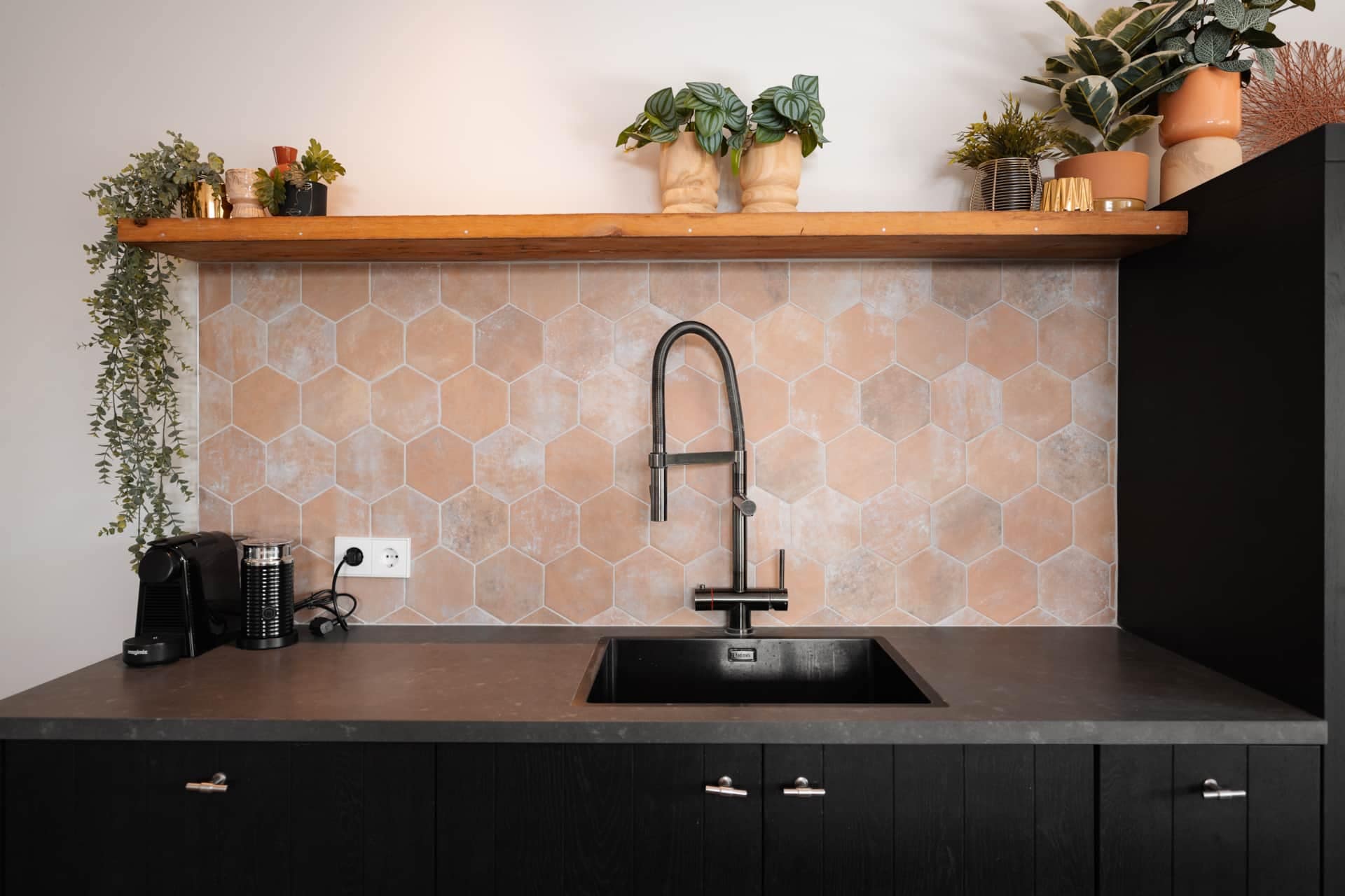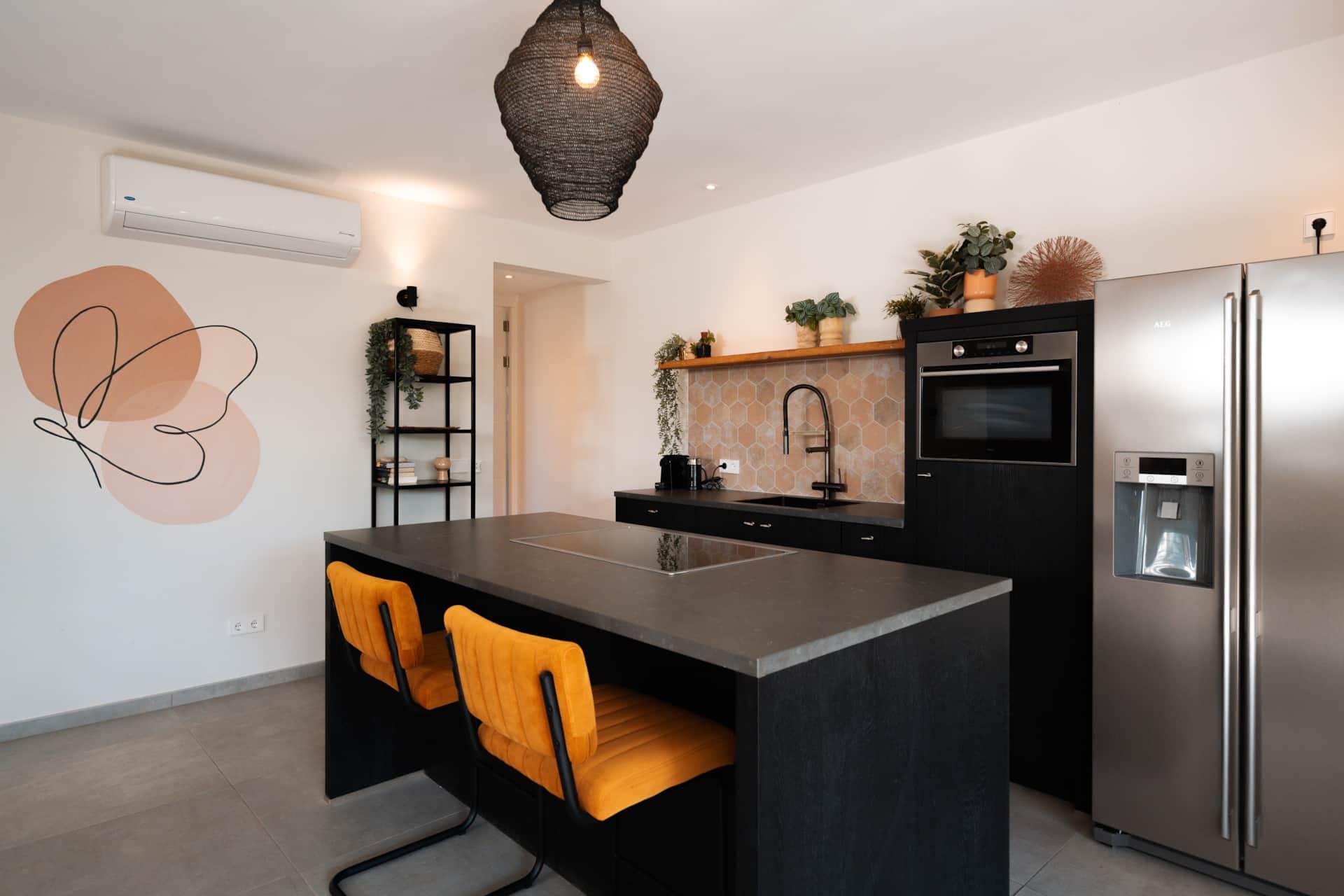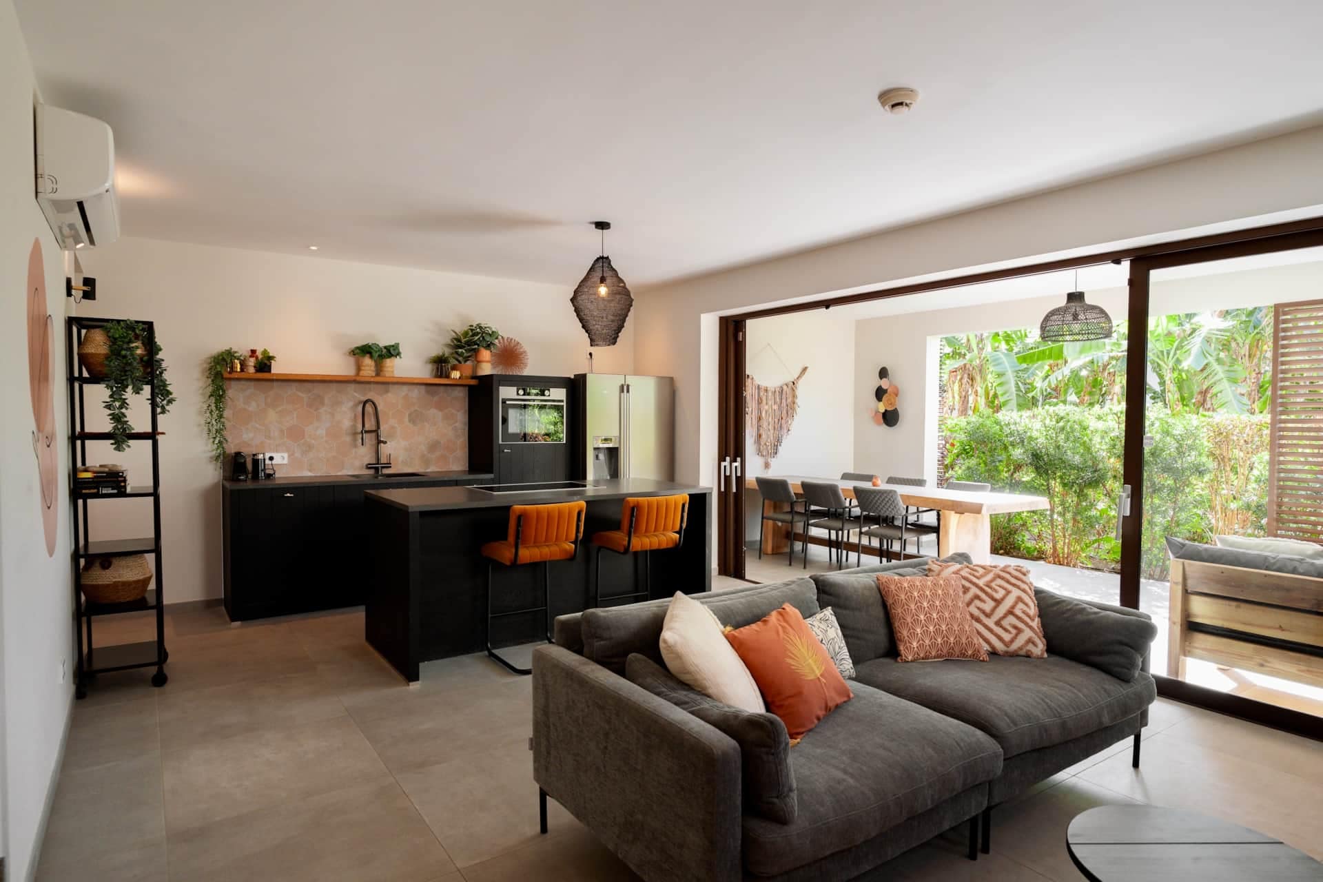 De open woonkamer en keuken zorgen voor een lichte en luchtige sfeer. De keuken is volledig uitgerust met moderne apparatuur: een Nespresso-machine, Quooker, vaatwasser, combimagnetron, inductiekookplaat en een Amerikaanse koelkast met vriesvak en ijsblokjesmachine. Ook zijn er 220 volt stopcontacten aanwezig.