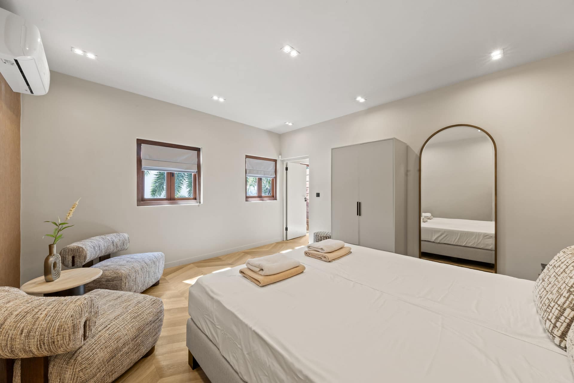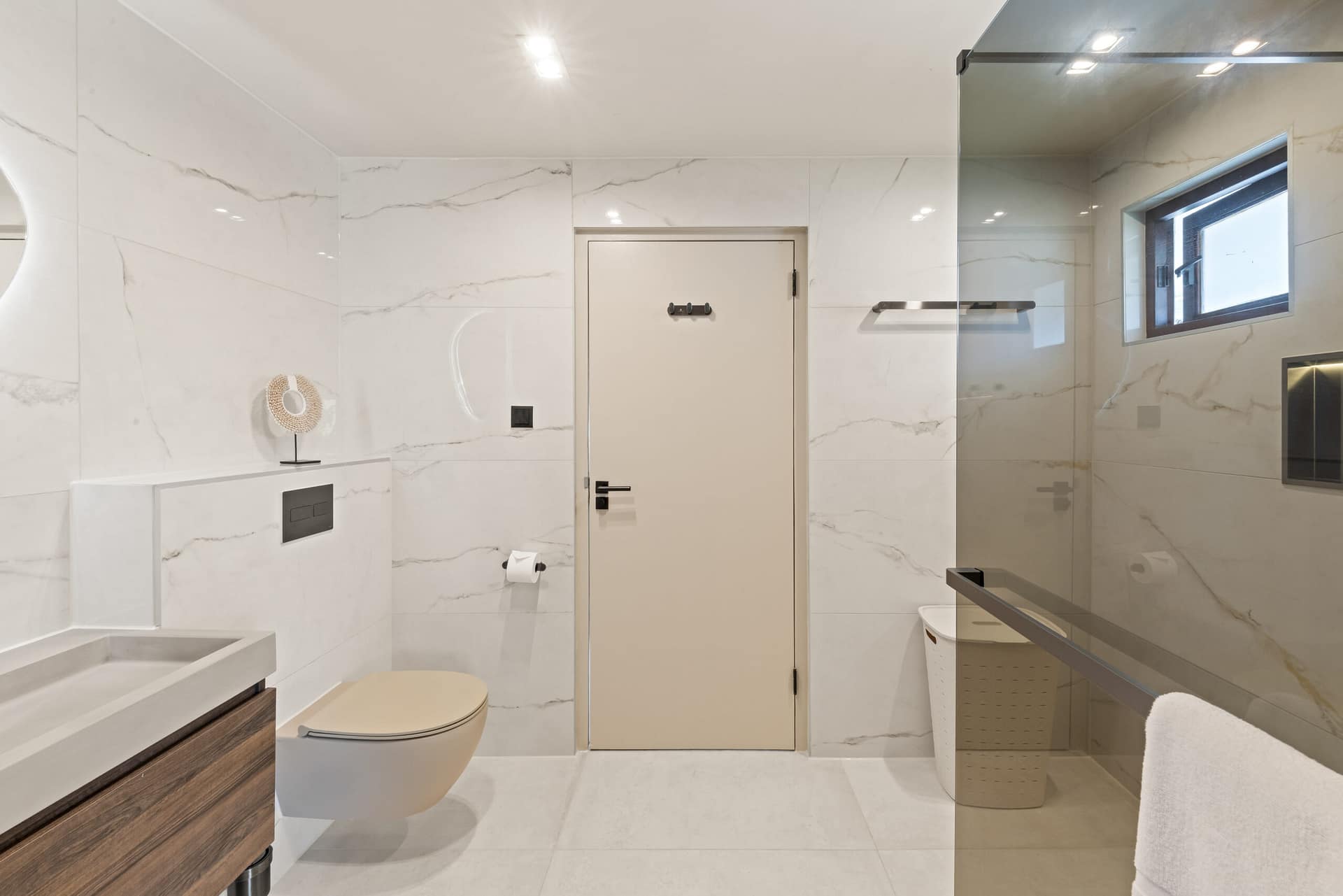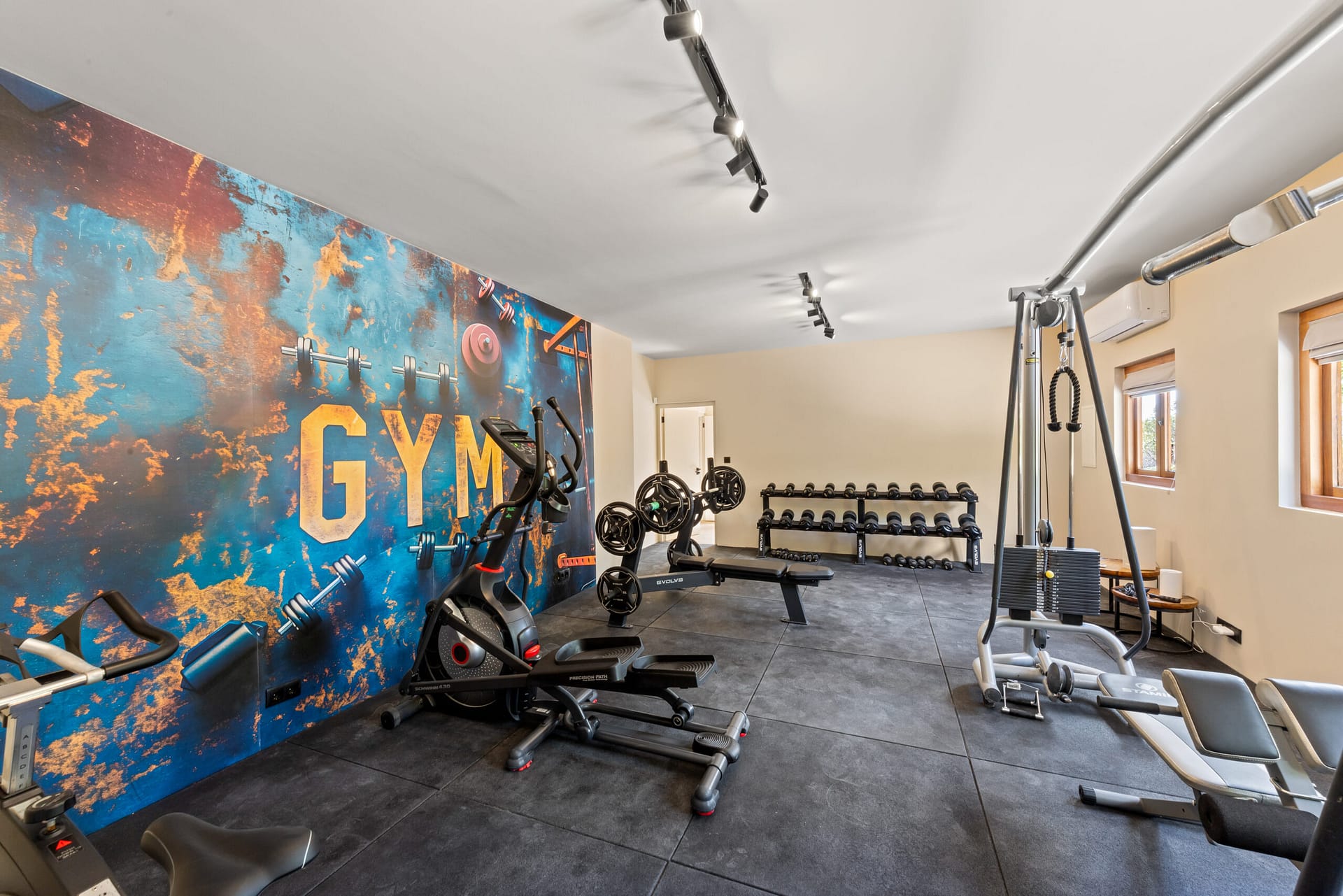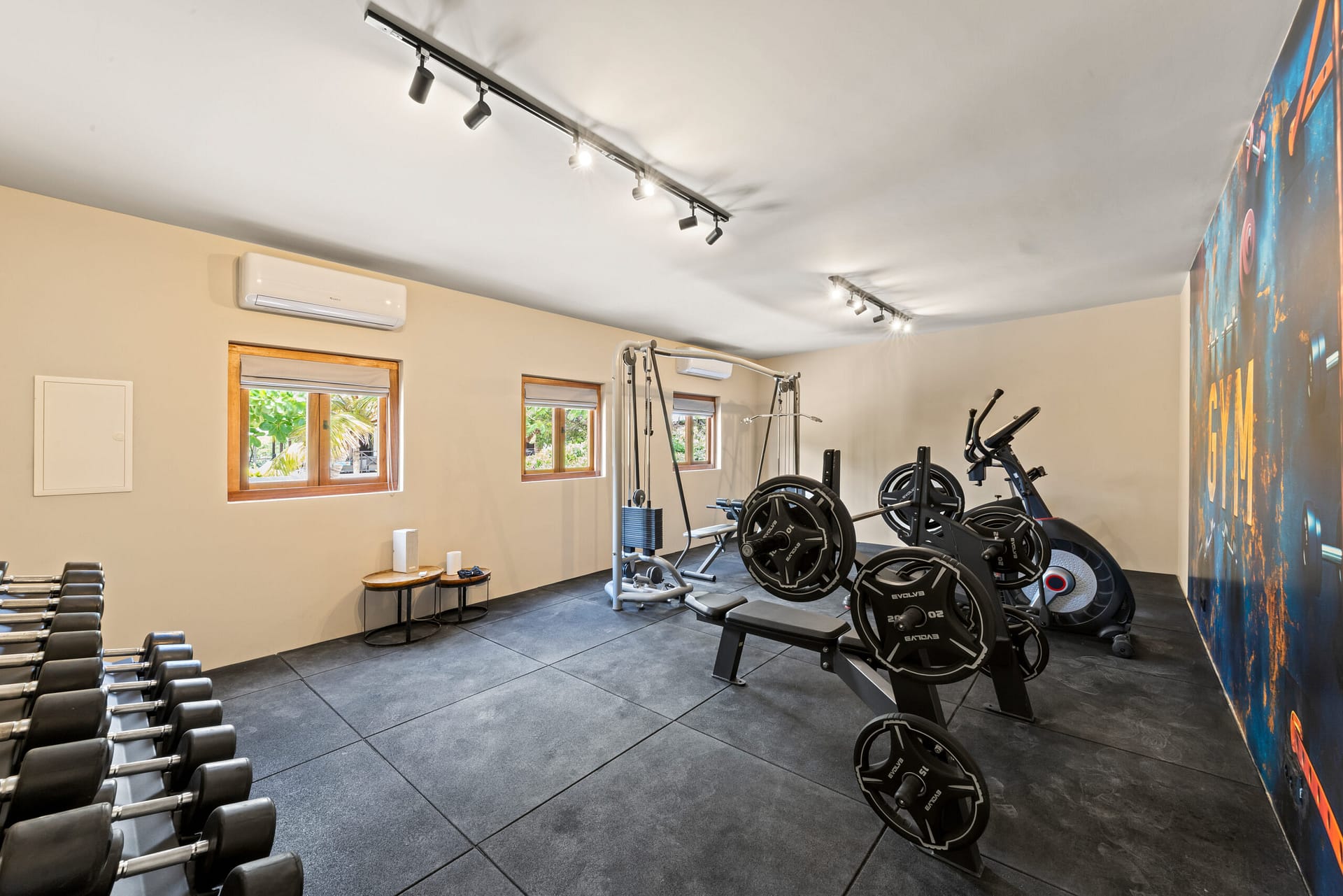 4 slaapkamers met ieder een eigen badkamer De villa zelf biedt ruimte aan drie prachtige slaapkamers met ieder een eigen badkamer. Twee slaapkamers beschikken over een kingsize bed (180×220) en een badkamer met toilet, inloopdouche en wastafel. De derde slaapkamer heeft een twee eenpersoonsbedden (90×220), die – indien nodig – kunnen worden omgebouwd tot een tweepersoonsbed. Uiteraard zijn alle slaapkamers voorzien van airconditioning. Via een vaste trap vanaf de porch bereikt u (onder het pooldeck) de 4de slaapkamer, de gym, een badkamer met inloopdouche en wastafel en een separaat toilet. Ook deze 4de slaapkamer beschikt over een kingsize bed (180×210) en airconditioning. De gym Tijdens uw verblijf op Curaçao kunt u uw workouts in uw eigen privé gym (met airconditioning!) gewoon voortzetten. De gym (30 m²) omvat diverse dumbells (van 2 tot 24 kg), een verstelbare drukbank, Technogym 4 station, Technogym drukbank met Olympische halterstang met tot 150 kg gewichten, een Schwinn crosstrainer en een bodybike suprême spinningfiets.