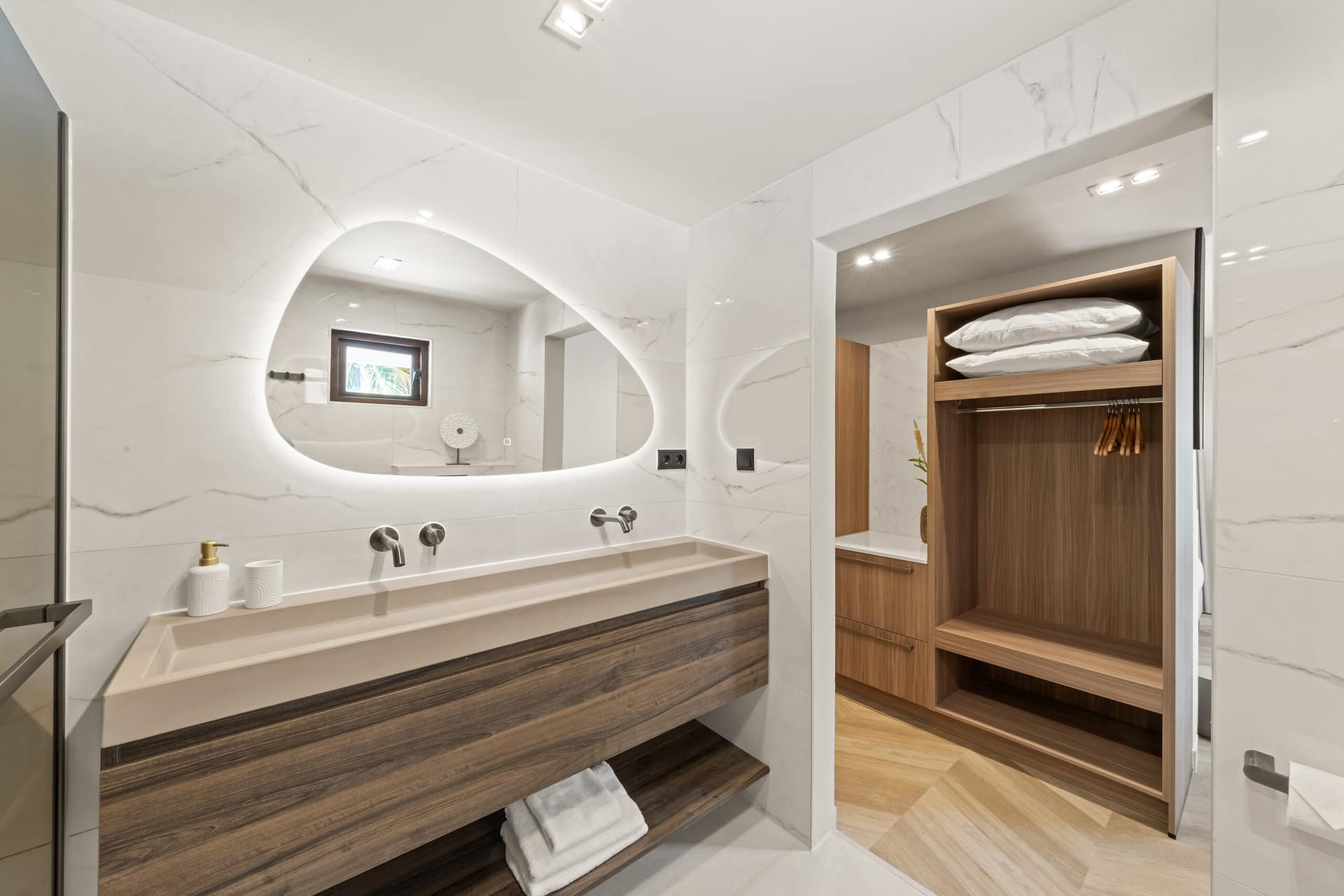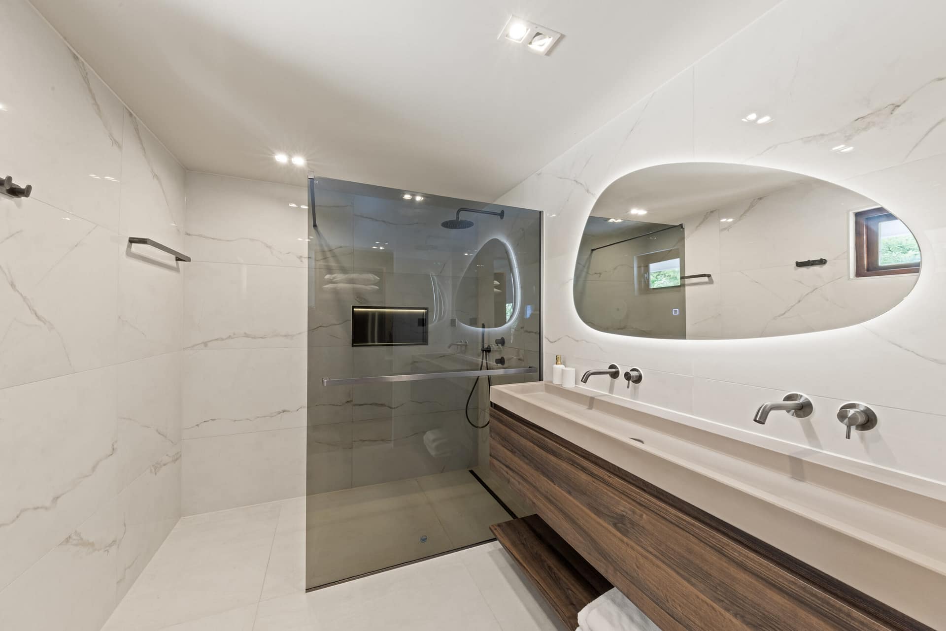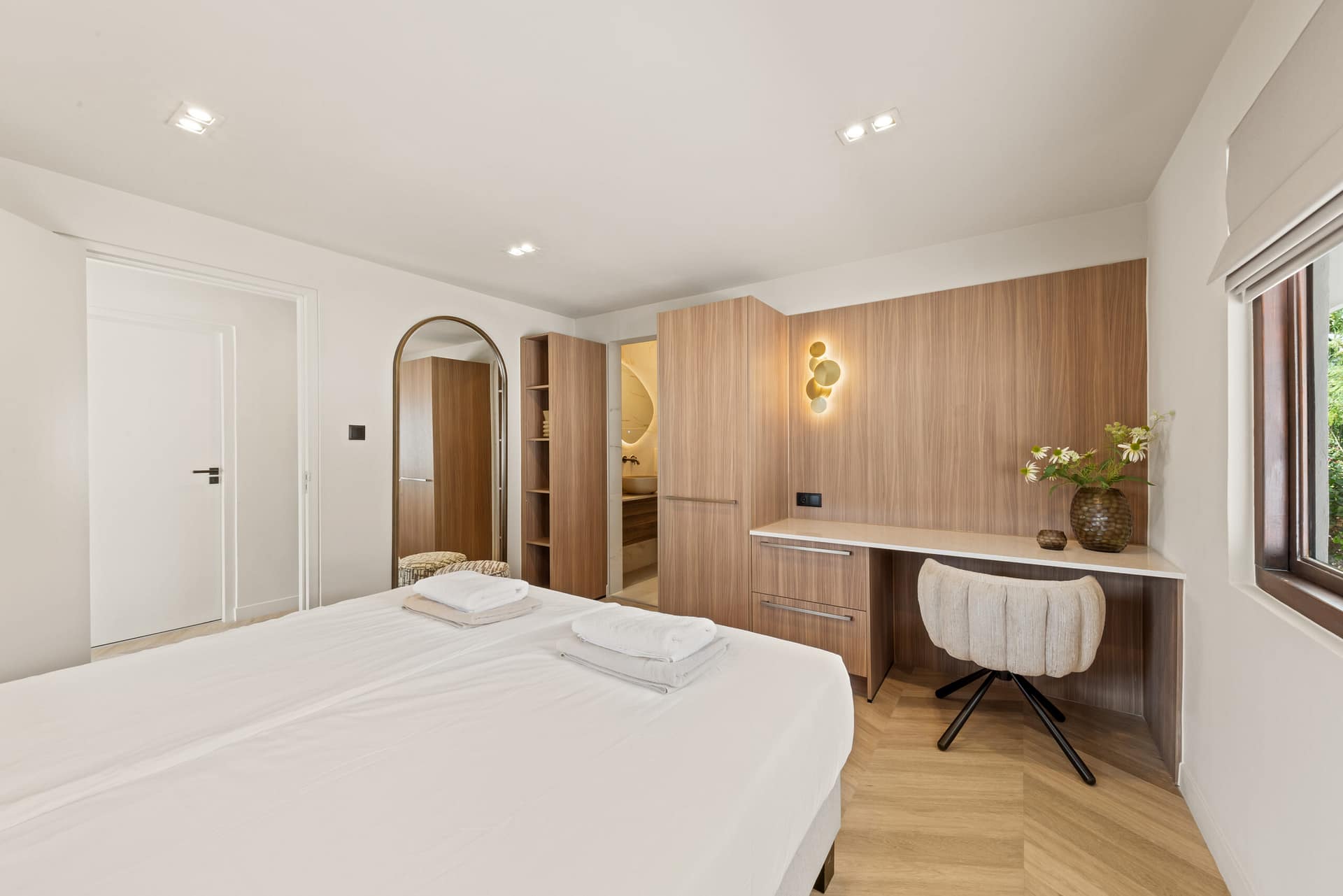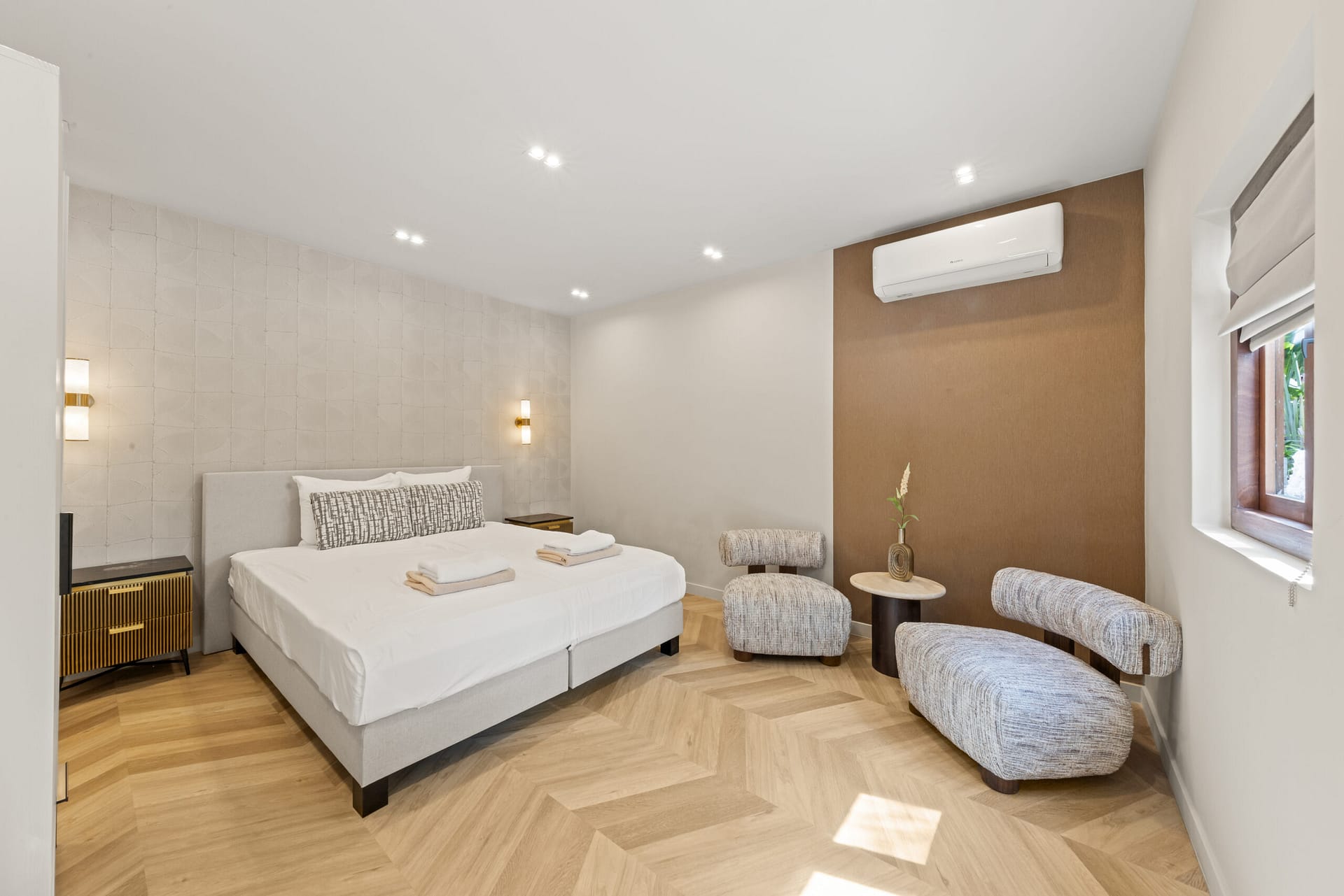 4 slaapkamers met ieder een eigen badkamer De villa zelf biedt ruimte aan drie prachtige slaapkamers met ieder een eigen badkamer. Twee slaapkamers beschikken over een kingsize bed (180×220) en een badkamer met toilet, inloopdouche en wastafel. De derde slaapkamer heeft een twee eenpersoonsbedden (90×220), die – indien nodig – kunnen worden omgebouwd tot een tweepersoonsbed. Uiteraard zijn alle slaapkamers voorzien van airconditioning. Via een vaste trap vanaf de porch bereikt u (onder het pooldeck) de 4de slaapkamer, de gym, een badkamer met inloopdouche en wastafel en een separaat toilet. Ook deze 4de slaapkamer beschikt over een kingsize bed (180×210) en airconditioning. De gym Tijdens uw verblijf op Curaçao kunt u uw workouts in uw eigen privé gym (met airconditioning!) gewoon voortzetten. De gym (30 m²) omvat diverse dumbells (van 2 tot 24 kg), een verstelbare drukbank, Technogym 4 station, Technogym drukbank met Olympische halterstang met tot 150 kg gewichten, een Schwinn crosstrainer en een bodybike suprême spinningfiets.