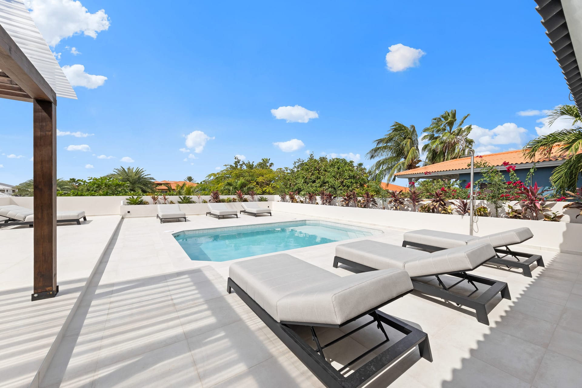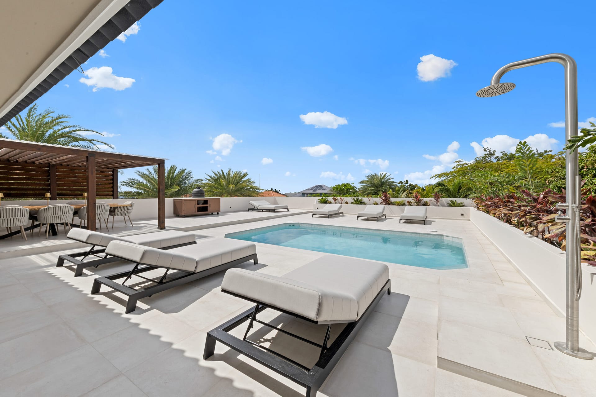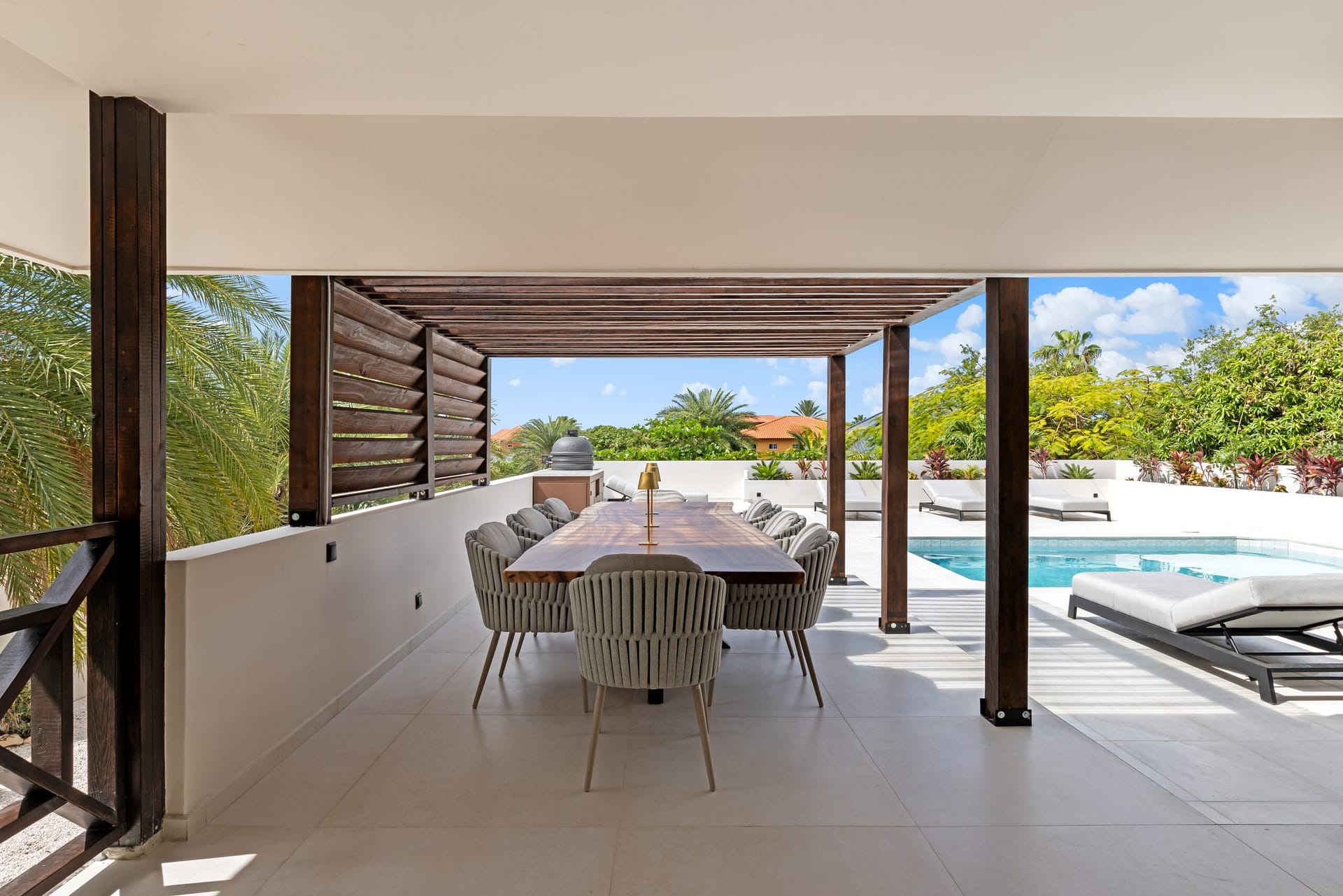 Fantastische buitenruimtes met buitenkeuken & eigen zwembad Vanuit de villa stapt u zo porch op. Hier kunt u lekker op de loungebank ploffen met een goed boek, naar uw favoriete muziek luisteren of gewoon genieten van de fantastische tuin en groene omgeving. Op Curaçao leeft men buiten; de boomstamtafel biedt dan ook alle ruimte voor uitgebreide diners die u in een handomdraai vanuit de complete leefkeuken of buitenkeuken met XL Fat Basterd BBQ op tafel zet. Loopt u vanaf de porch ietsjes verder door naar het pooldeck dan kunt u een verfrissende duik in uw eigen zwembad nemen. Dit zoutwater zwembad is huidvriendelijk en voorkomt rode ogen. Optimale privacy